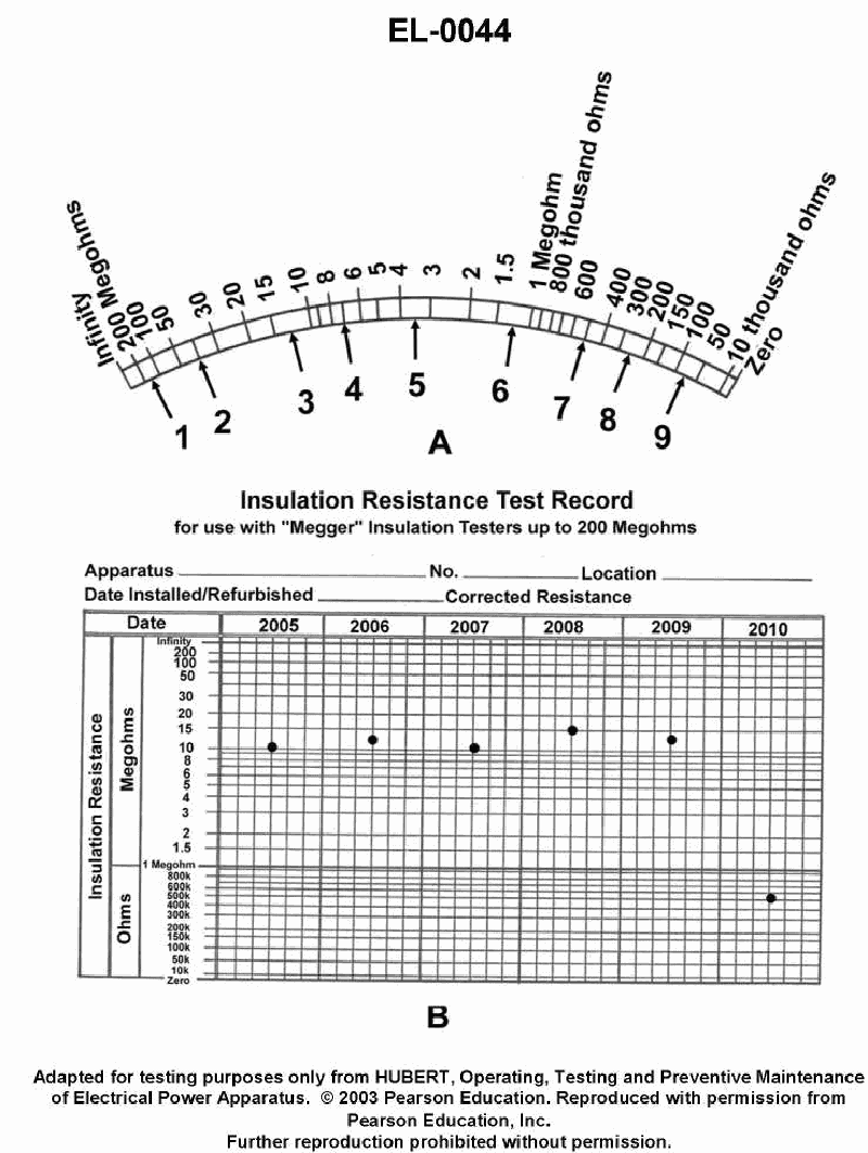• Verify which labeled tick marks (e.g., 2, 3, 4, 5 megohms, etc.) are just to the left and right of the vertical line from "5"; the correct reading should fall between them.