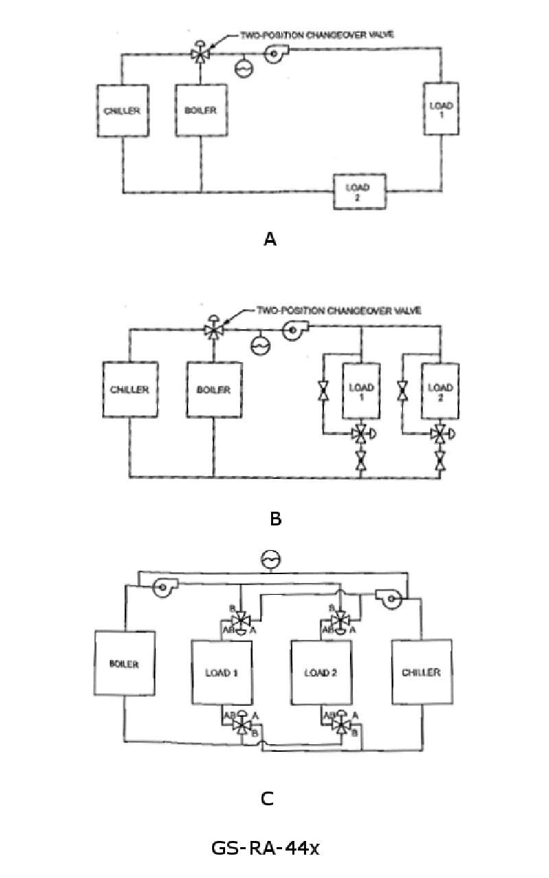 What statement is true concerning figure "C" of the illustrated hydronic heating/cooling systems? See illustration GS-RA-44.