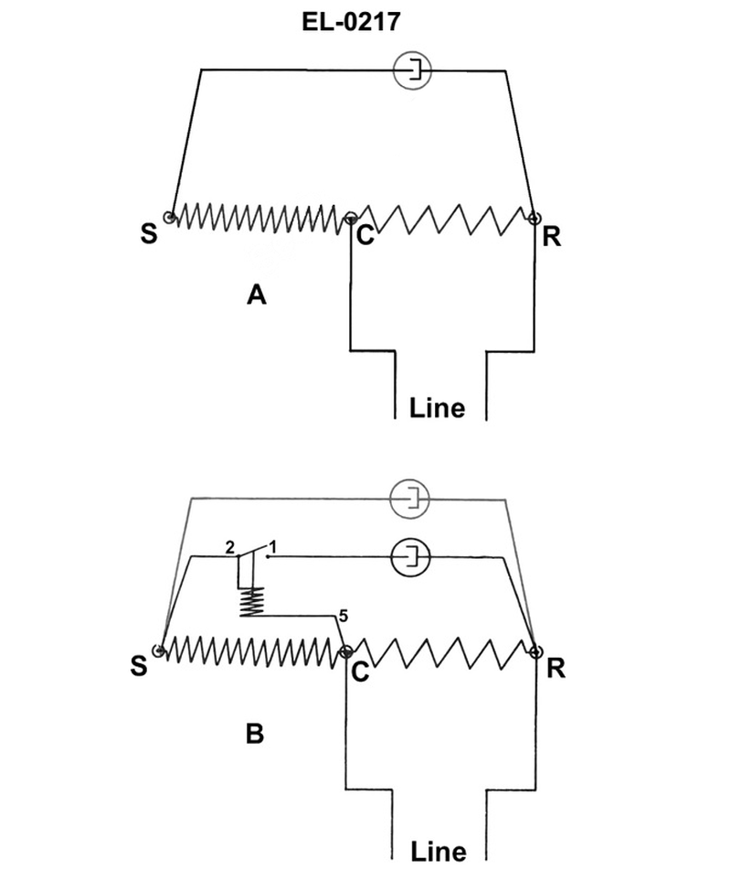 What type of motor is illustrated by the schematic of figure "A" of the illustration and what type of starting relay is used? See illustration EL-0217.