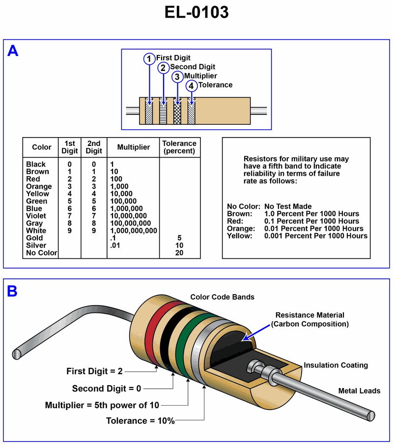 What would be the resistance tolerance of a carbon resistor which is color-coded as red, violet, brown, and silver in bands 1 thru 4 respectfully as shown in figure "A" of the illustration? Illustration EL-0103