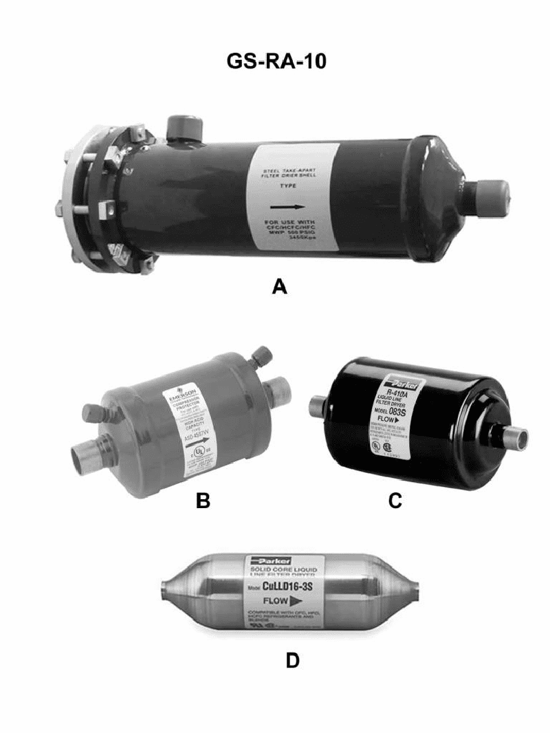 Which of the following dehydrators or combination filter/driers is most likely to be used in the suction line of a refrigeration unit? See illustration GS-RA-10.