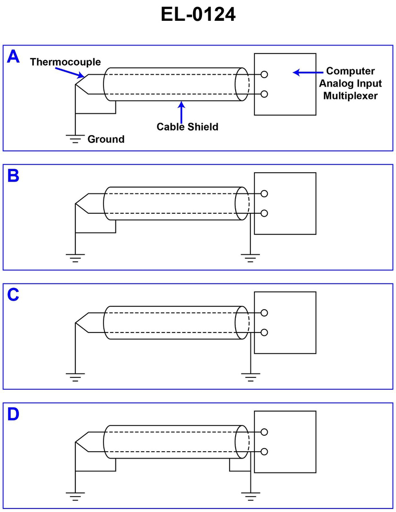 Which of the following illustrations represents the proper method of circuit grounding for a low level analog signal cable? Illustration EL-0124