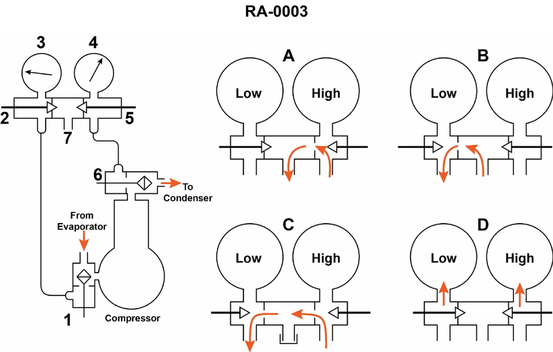 Which of the hand valve configurations for the gauge manifold set is the correct set up for removing the remaining refrigerant from the gauge manifold set with the discharge service valve back-seated in preparation for removing the gauge manifold set? See illustration GS-RA-03.