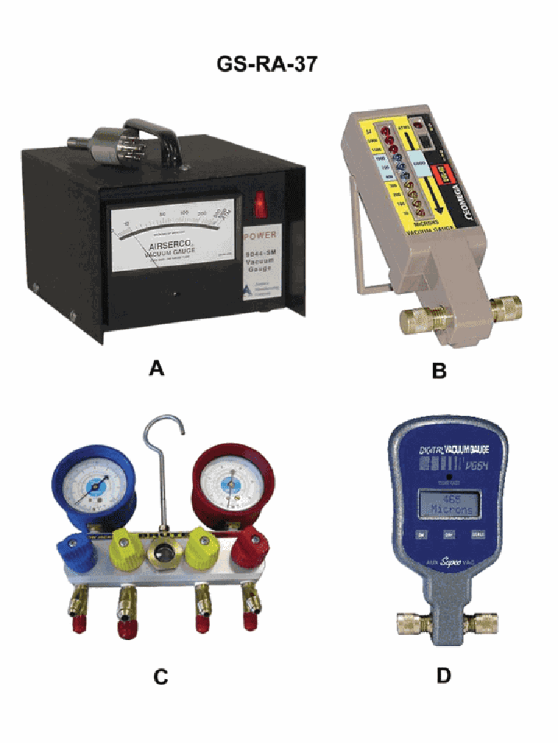 Which of the illustrated gauges is capable of measuring vacuums at the micron level for the purpose of proving system dehydration during system evacuation with a vacuum pump, but displays the achieved vacuums at incremental threshold intervals rather than continuously? Illustration GS-RA-37