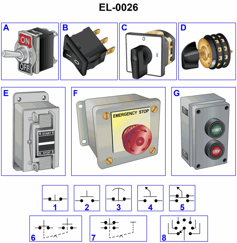Which of the illustrated schematic symbols represents the type of switch pictured in figure "F" of the illustration? Illustration EL-0026