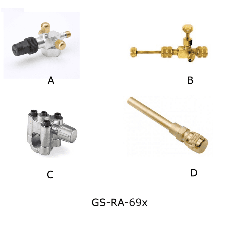 Which of the illustrated valves is used to gain access to a hermetic system not fitted with service valves or access fittings by means of piercing the refrigeration system tubing? See illustration GS-RA-69.