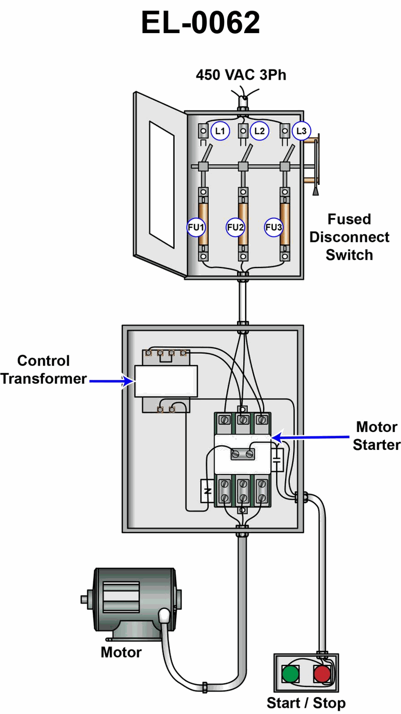 With power available at the fuses and the motor disconnected from line, the following voltage readings are taken: Top of "Fu 1" to bottom of "Fu 2" reads 450 VAC Top of "Fu 1" to bottom of "Fu 3" reads 450 VAC Top of "Fu 2" to bottom of "Fu 1" reads 0 VAC Top of "Fu 3" to bottom of "Fu 1" reads 0 VAC What condition is indicated? See illustration EL-0062.