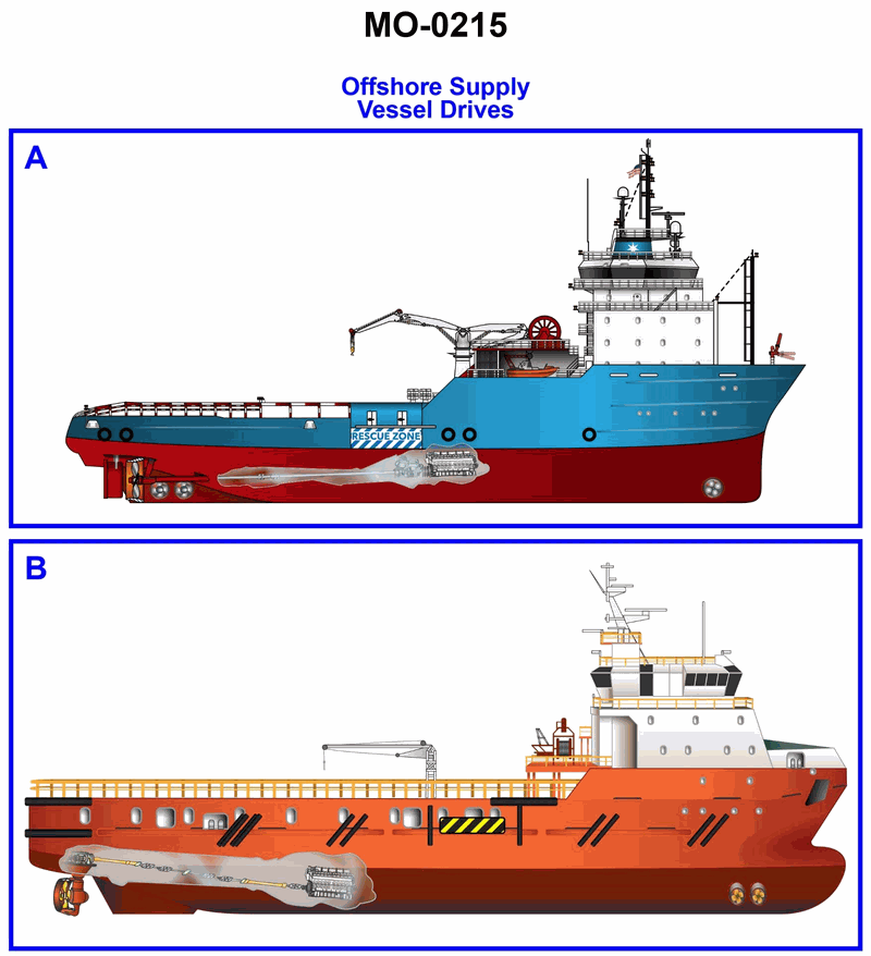 You are assigned to an anchor handling supply vessel with a propulsion system as shown in figure "B" of the illustration. What type of propulsion system is illustrated? Illustration MO-0215