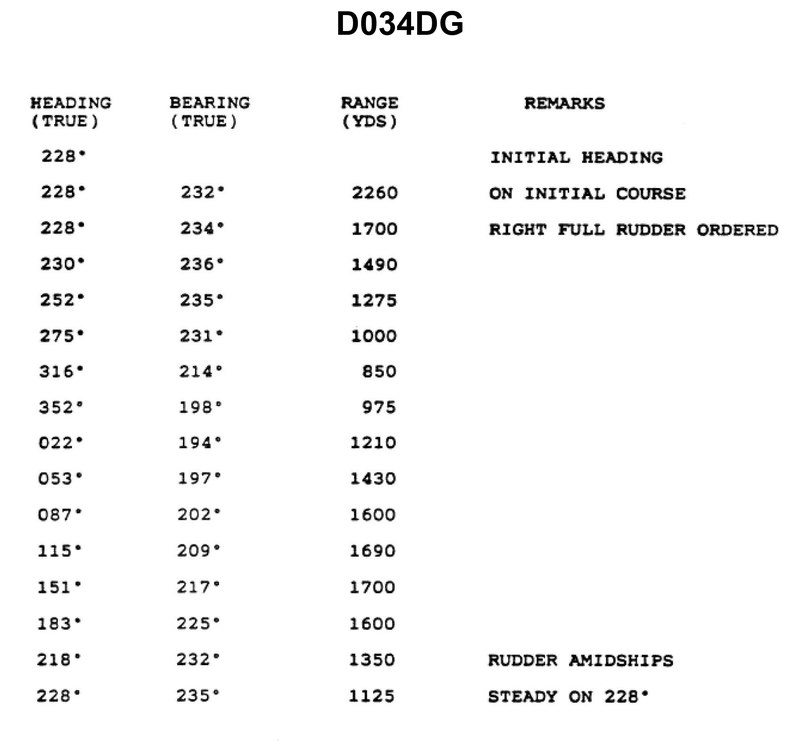 You are conducting trials to determine the maneuvering characteristics of your vessel. While making a turn, you take ranges and bearings of an isolated light with the results as shown. Based on this information, what is the advance for a turn of 75?? ILLUSTRATION D034DG