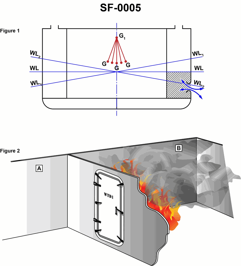 You are in compartment "A" as shown in Figure 2 of the illustration, and suspect there is a fire in compartment "B". In order to check for and confirm the fire in compartment "B" you should __________. Illustration SF- 0005