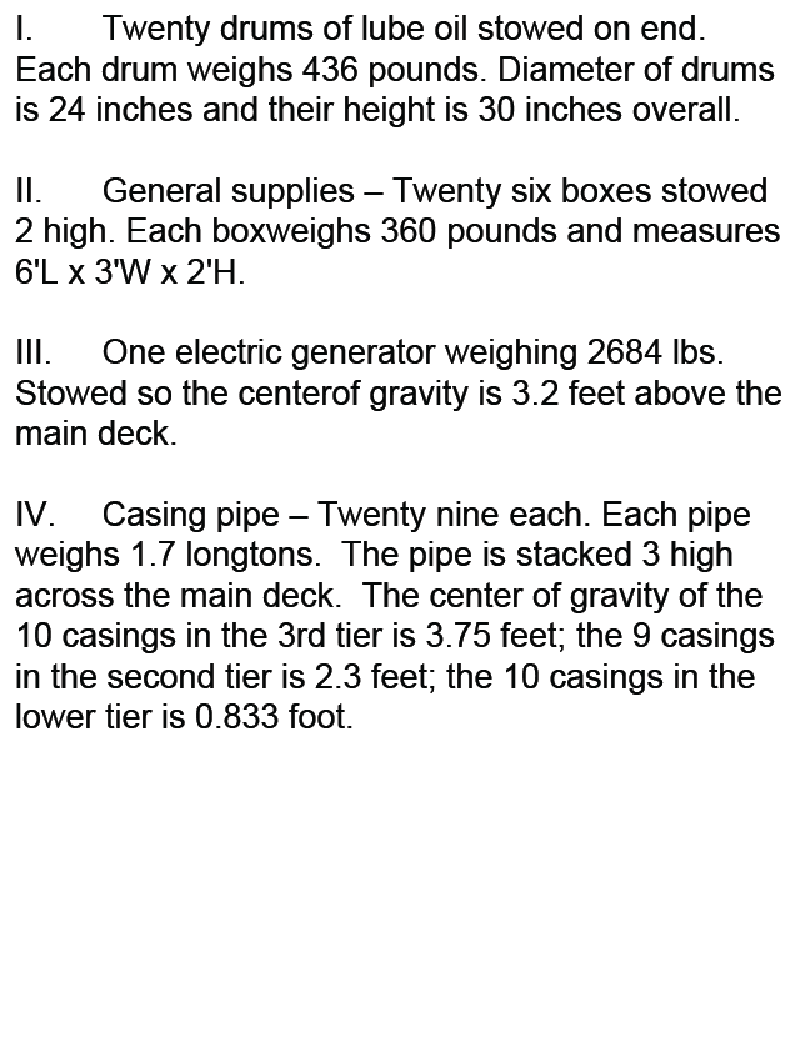 • Compute and write down the total weight of each group (drums, boxes, generator, each pipe tier) and its moment = weight × CG height.