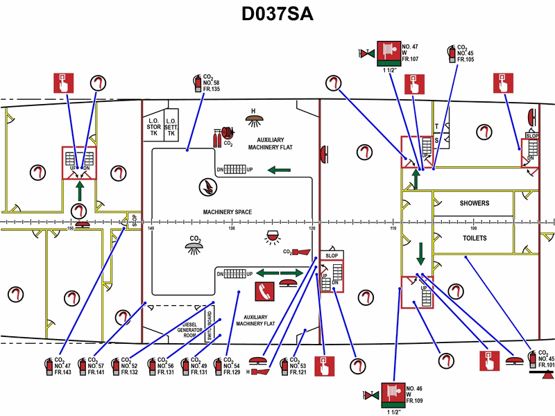 You are on the second deck in the main machinery space. Utilizing illustration D037SA below what emergency equipment, if any, is located at frame 107?