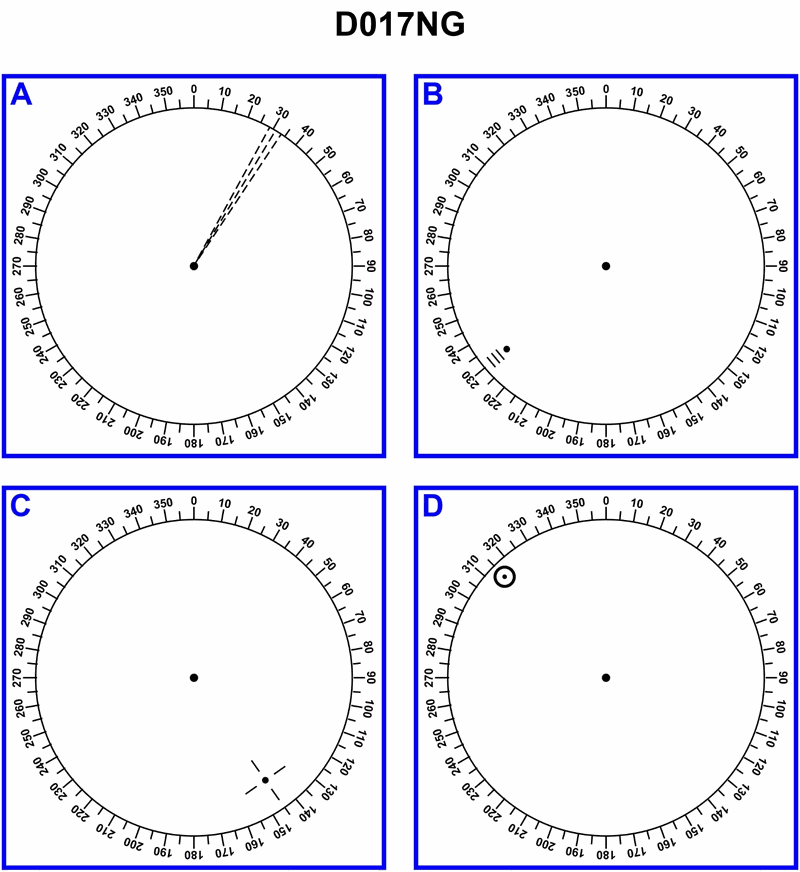 You are radar scanning for a buoy fitted with a racon. In illustration D017NG below, which radar screen represents the presentation you should expect on the PPI?