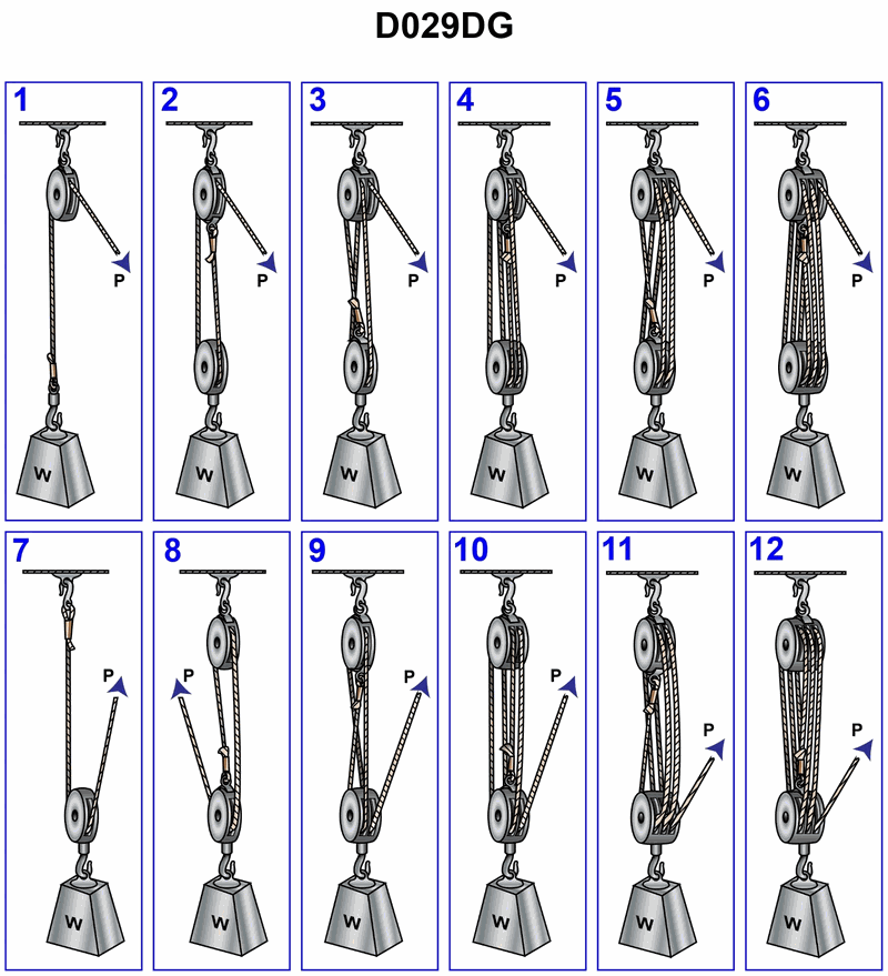 You are using tackle number 8 in illustration D029DG below to lift a weight of 100 lbs. If you include 10 percent of the weight for each sheave for friction, what is the pull on the hauling part required to lift the weight?