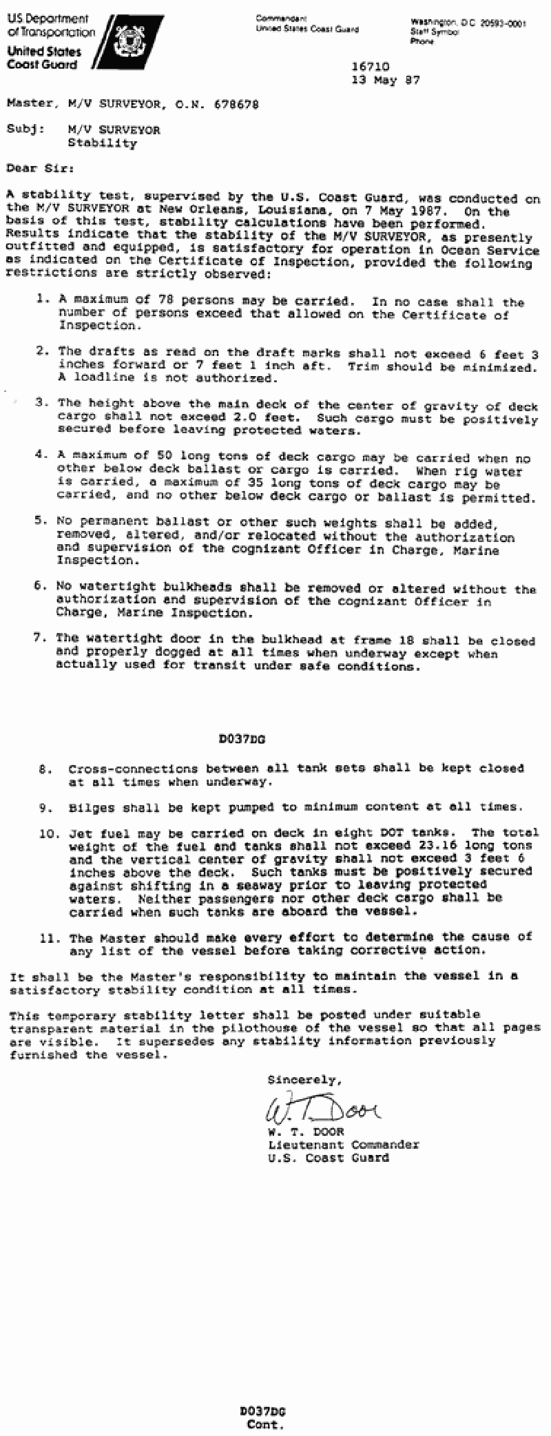 You have 10 containers of rig supplies each measuring 10'L by 6'B by 6'H and weighing 1.8 tons each. Each container is stowed on deck. What is the maximum VCG permitted of the remaining cargo if you are carrying rig water and load to maximum capacity? See illustration D037DG below.