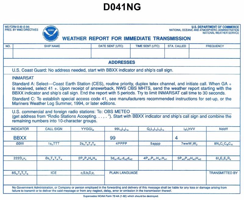 Your vessel is participating in the Voluntary Observing Ship Program, you are preparing WS Form B-80 as seen in illustration D041NG below. One-half of the sky is covered with clouds, and the anemometer indicates that the apparent wind is from 340° relative at 14 knots. You are on course 307° T at 12.6 knots. How should you encode group Nddff?