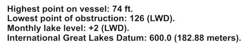 Your vessel is underway and approaching an overhead obstruction on Lake Superior. Given the following information, determine the clearance between your vessel and the obstruction. Highest point on vessel: 74 ft. Lowest point of obstruction: 126 (LWD) Monthly lake level: +2 (LWD) International Great Lakes Datum: 600.0 (182.88 meters)
